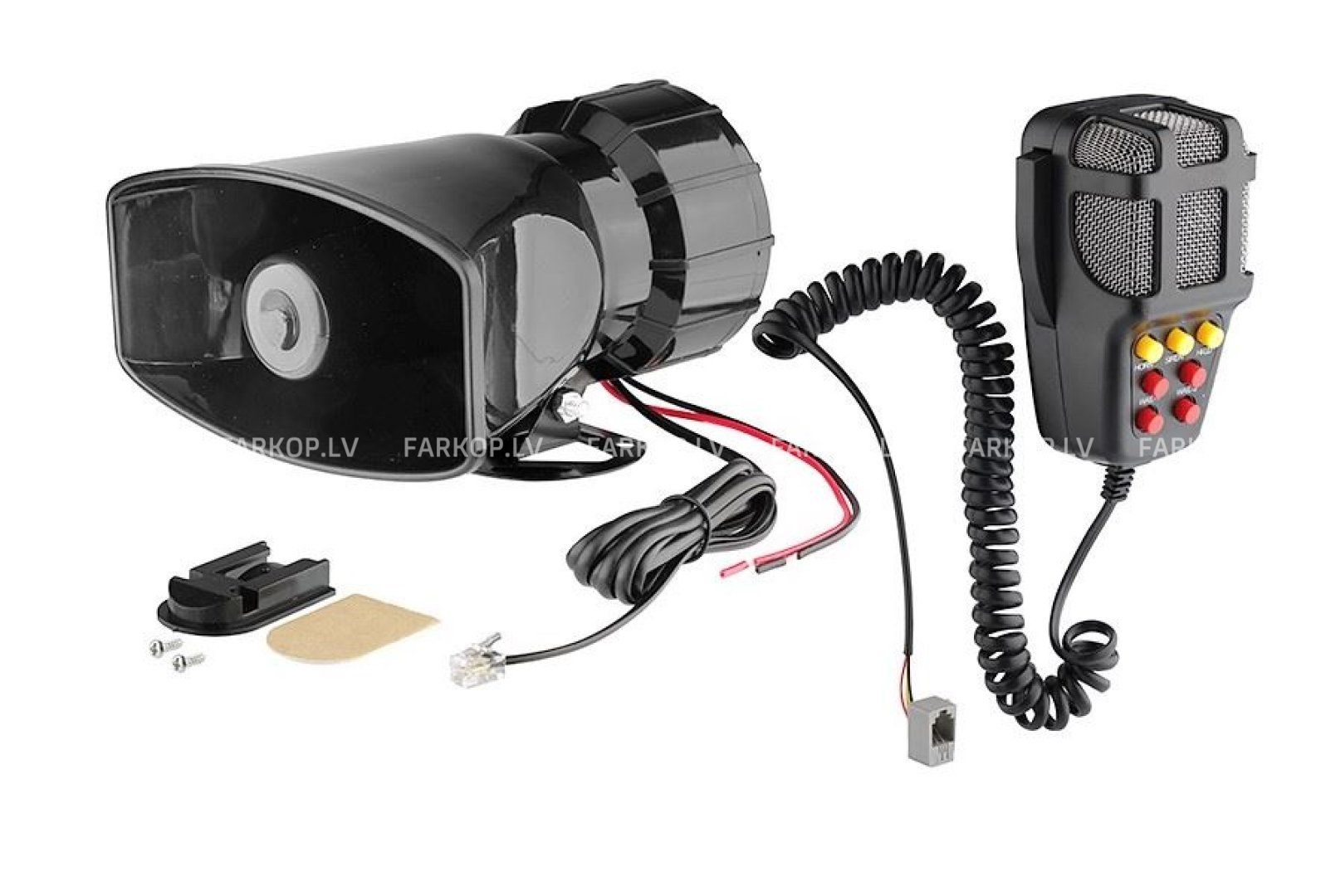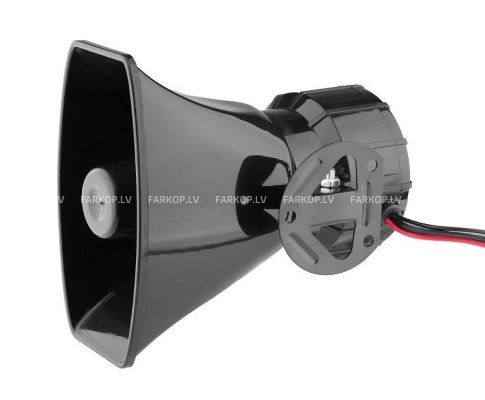 Electronic siren with megaphone with 7 different sounds. The signal is controlled by buttons on the megaphone. The sound is clear and loud. The siren is made of a solid and durable casing, which is resistant to damage. in a car, boat and truck. Technical data: 7-ton Power: 100W power supply: 12V coiled cable: 50-200 cm Set includes: 1x siren 1x microphone mounting bracket
