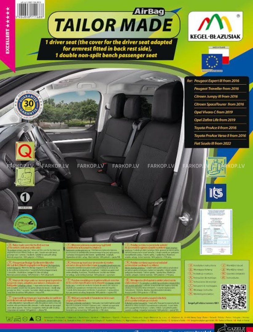 Tailor-made covers for the first seat row of the vehicles indicated on the label.