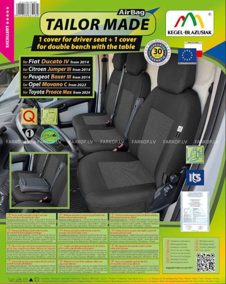 Tailor made covers for the first seat row of the vehicles indicated on the label.