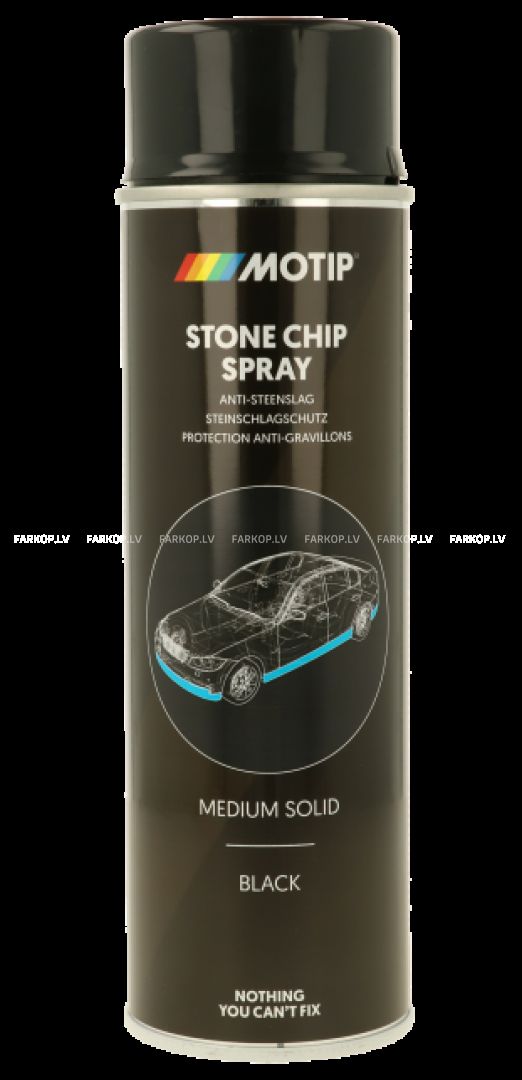 Aizsargājiet automašīnas apakšu un redzamās virsbūves daļas no šķembām ar MOTIP akmens šķembu aerosolu. Akmens šķembu aerosolu var pārkrāsot ar visām krāsām, un tam ir lieliska aizsardzība pret rūsu. Akmens šķembu aerosols ir izturīgs pret laikapstākļiem, vājām skābēm un bāzēm, absorbē skaņu un saglabā elastību.