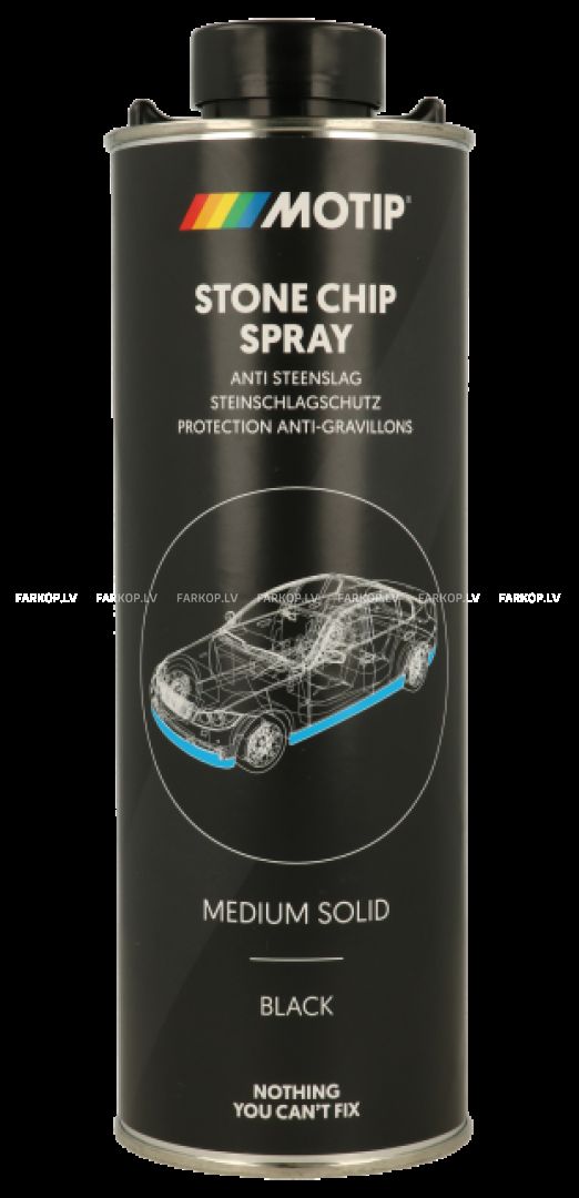 Aizsargājiet automašīnas apakšu un redzamās virsbūves daļas no šķembām ar MOTIP akmens šķembu aerosolu. Akmens šķembu aerosolu var pārkrāsot ar visām krāsām, un tam ir lieliska aizsardzība pret rūsu. Akmens šķembu aerosols ir izturīgs pret laikapstākļiem, vājām skābēm un bāzēm, absorbē skaņu un saglabā elastību.