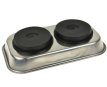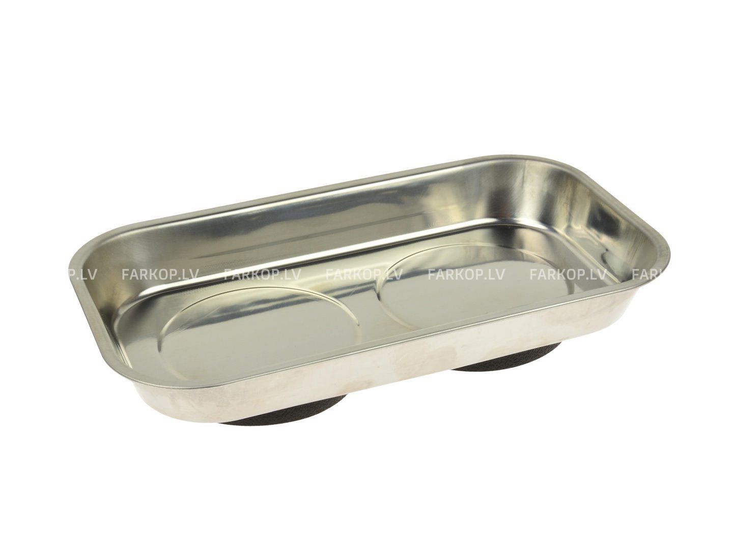 Paplāte ir aprīkota ar diviem spēcīgiem magnētiem gumijas pārklājumā. Magnēti ļauj droši piestiprināt paplāti ērtā vietā un pasargāt uzglabātās detaļas no nokrišanas vai izbiršanas. Paplāte ir izgatavota no divslāņu hromēta, pulēta metāla lokšņu materiāla.
