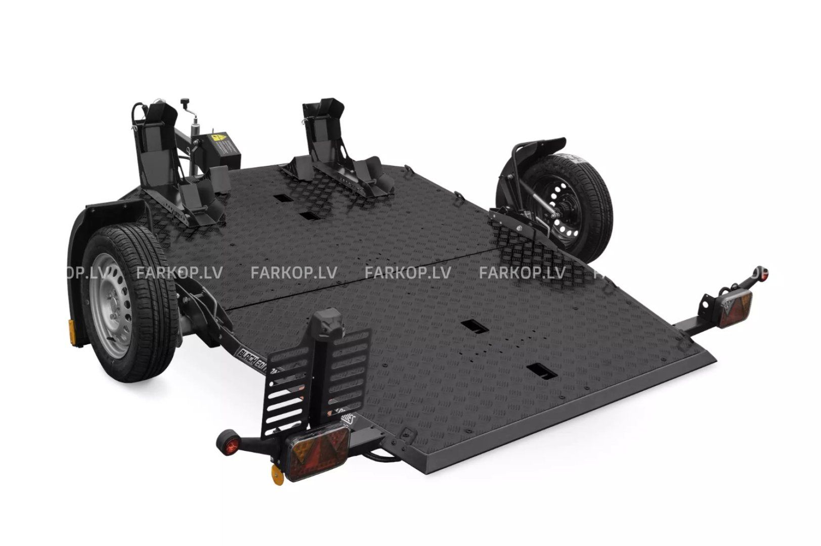 - Ērta iekraušana: Aizmugurējā platforma viegli nolaižas līdz zemei, vienkāršojot iekraušanu un izkraušanu bez nepieciešamības pēc rampām. - Salokāma uzglabāšana: Inovatīvā HALF FOLD sistēma ļauj piekabi salocīt uz pusēm kompaktai uzglabāšanai, kas ir ideāli piemērota garāžām ar ierobežotu vietu (salocītas formas izmēri: 2416x3534x956 mm).