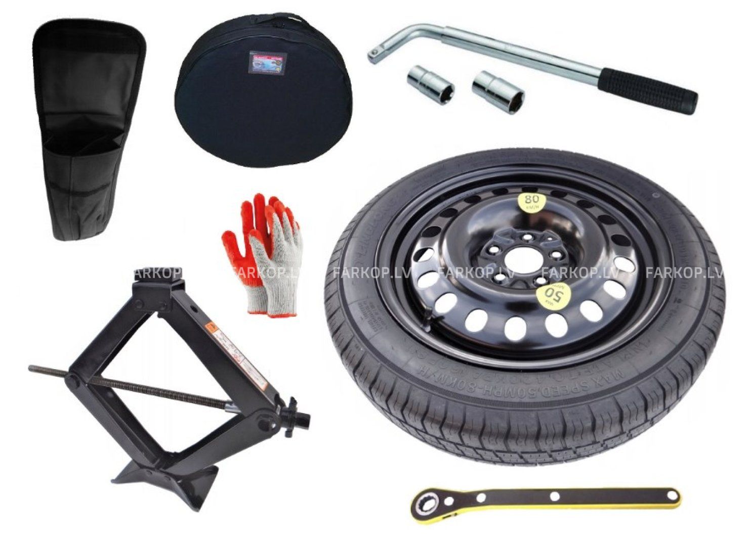 Kompakts rezerves ritenis un instrumentu komplekts 135/80 R17