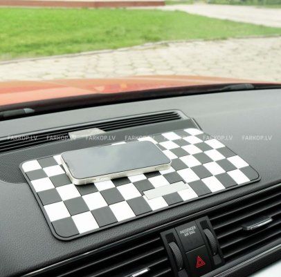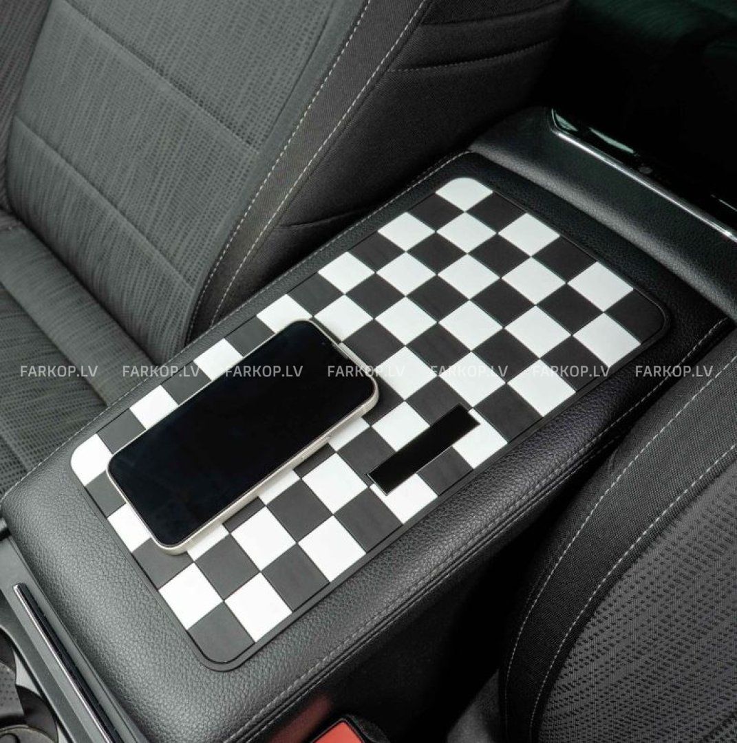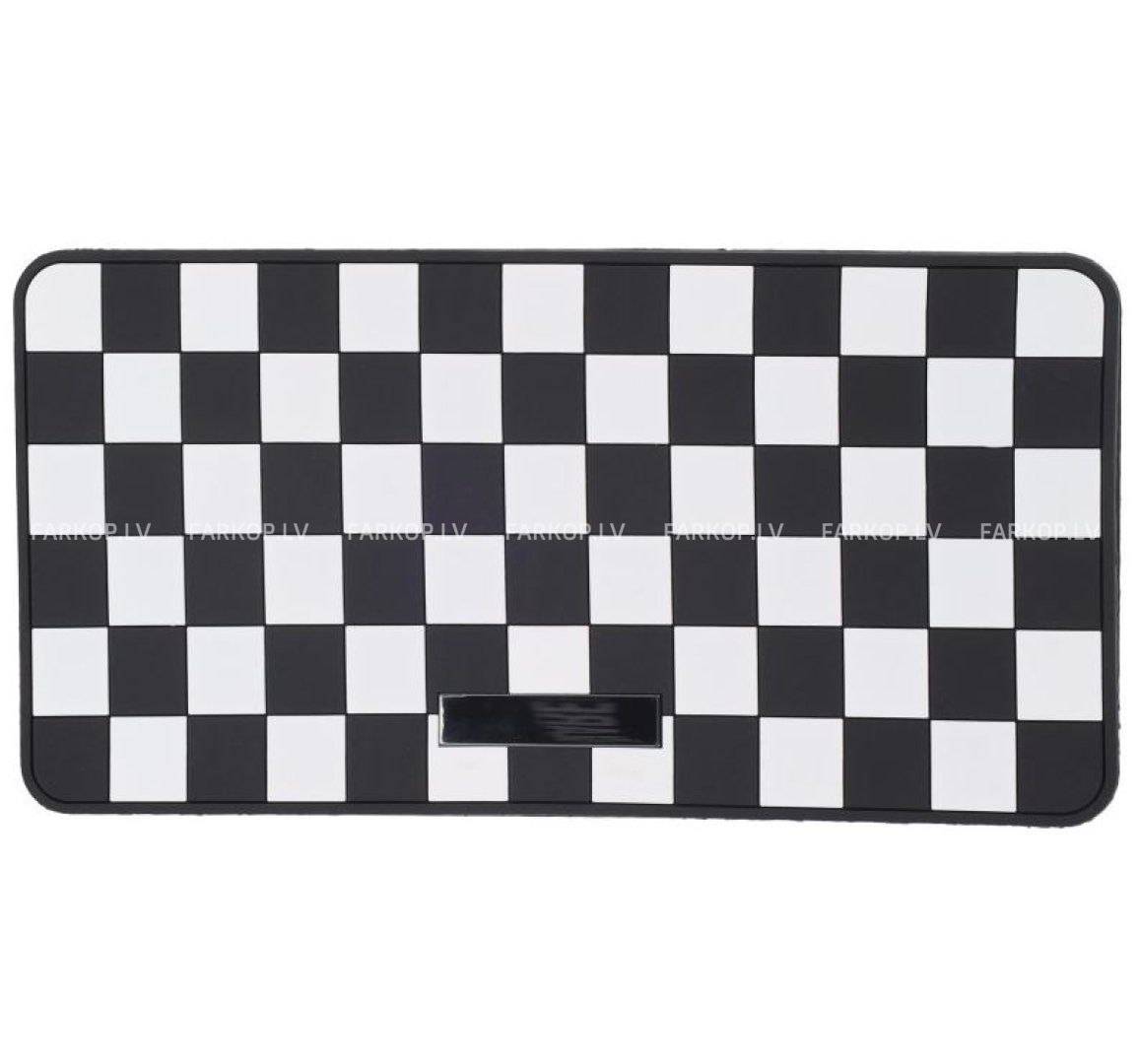Virsmai ir klasisks šaha raksts melnbaltā krāsā, kas ne tikai izskatās stilīgi, bet arī efektīvi novērš priekšmetu slīdēšanu braukšanas laikā. Paklājiņam nav nepieciešama līme vai papildu uzstādīšana – vienkārši novietojiet to uz tīras paneļa virsmas.